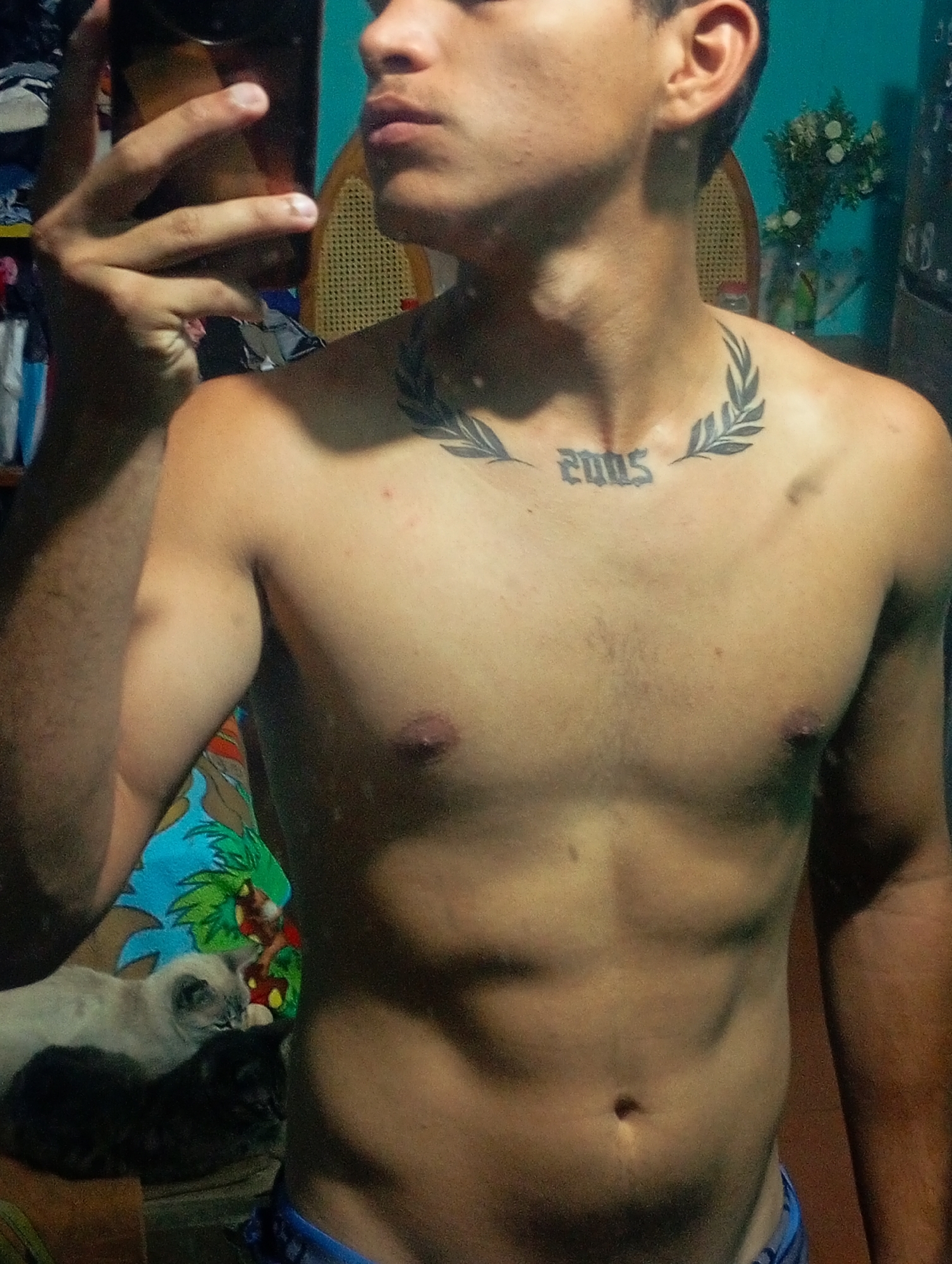 A shirtless young man with a "2005" tattoo on his upper chest is taking a selfie. Behind him, two cats are sleeping on a surface covered with a tropical-patterned cloth. Behind that is a vase of flowers, and a mirror is reflecting an interior with clothing. The location is not specified to be in Altagracia, Venezuela.