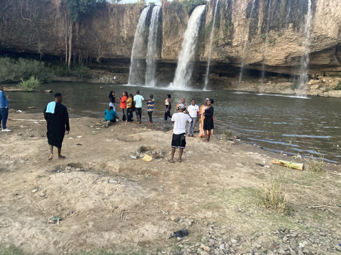 The image captures a scene at multiple waterfalls in Kukum, Nigeria