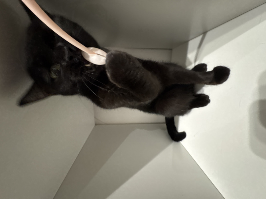 - "A black cat lying on its back in a white box, seemingly playing with a light pink object held above it" by FM-fLERp2, licensed under CC BY 4.0