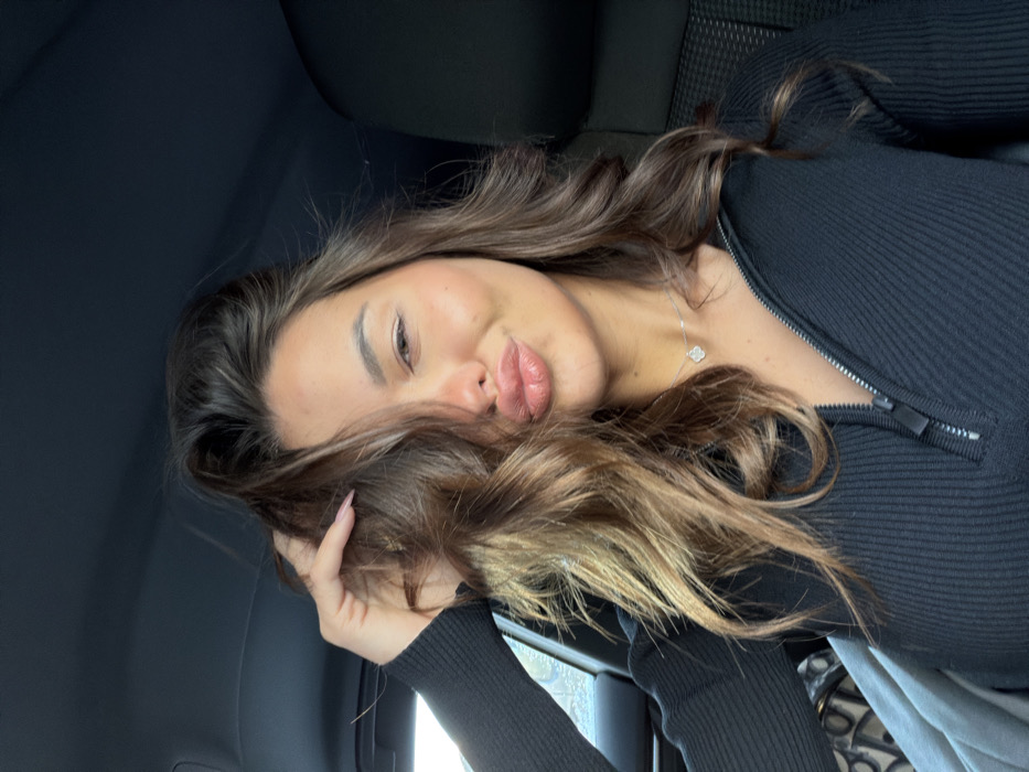 A young woman with long, brown, wavy hair poses with a playful pout. She wears a black, zip-up top and a delicate necklace. Her left hand rests on her head, partially obscuring her face with strands of hair. The photo appears to be taken inside a car, with the car's interior visible in the background. The overall lighting is soft and natural, highlighting her features.