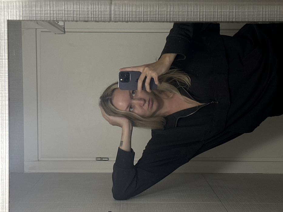 The image is a mirror selfie depicting a single female individual indoors. **Location:** The setting is an interior room, characterized by a plain, light-colored door with a visible hinge and a light-grey textured wall, possibly tiled, to the left. No visual information within the image definitively identifies its specific location as the city of Tel Aviv, Israel. **People:** One adult female with shoulder-length blonde hair is visible. She has a neutral to slightly pensive facial expression, looking towards the smartphone's camera. Her left inner forearm displays a small, dark-colored rectangular tattoo. **Subjects/Objects:** * **Female:** Dressed in a black, long-sleeved, quarter-zip top or hoodie, open slightly at the collar. * **Smartphone:** A dark-colored (e.g., purple/blue) smartphone, consistent with a modern iPhone model featuring a multi-lens camera array, is held in her right hand, pointed towards the mirror. * **Mirror:** A large, rectangular mirror frames the reflection. * **Room features:** The background reflected in the mirror includes a light-colored, possibly off-white or light-grey, door with a metal hinge on its left edge. To the left of the door, a wall with horizontal, textured, light-grey paneling or tiling is visible. **Actions:** The woman is actively taking a photograph of her reflection in the mirror (a "selfie"). Her right arm is extended, holding the smartphone. Her left arm is bent at the elbow, with her hand resting on the left side of her head, and her elbow appears to be leaning against the textured wall. Her gaze is directed towards the smartphone's camera lens. **Interactions:** The primary interaction is between the individual and her reflection, facilitated by the smartphone for capturing the image. **Environment:** The environment is an interior space, possibly a bathroom or dressing area, indicated by the presence of a large mirror, a door, and wall finishes. The lighting appears uniform, suggesting indoor artificial illumination.