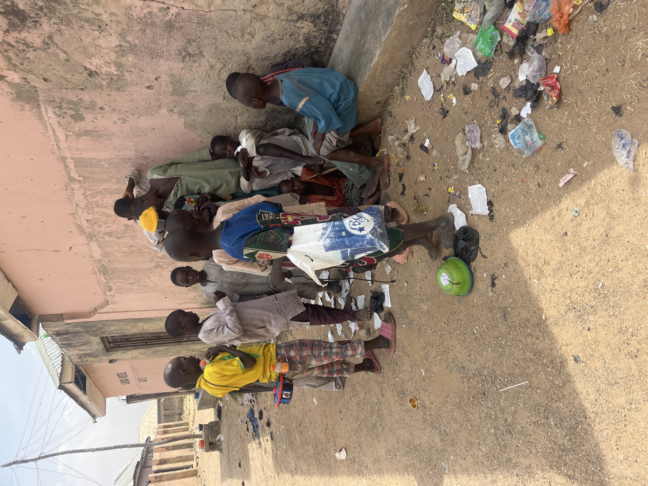 The image depicts an outdoor scene in Dabawa, Nigeria, featuring approximately eleven individuals, predominantly male children and youth, gathered on an unpaved dirt surface