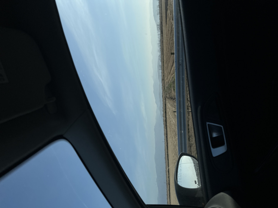 The image captures a daytime landscape view from the interior of a vehicle, looking out the front passenger window in Malo Konare, Bulgaria