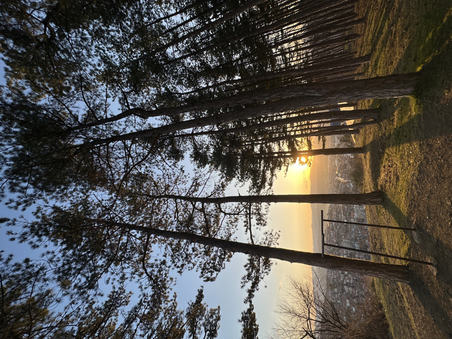 The image depicts a panoramic view of Dupnitsa, Bulgaria, from an elevated, forested vantage point at sunset. The scene is dominated by numerous tall, slender pine trees with dark trunks and sparse needle foliage, silhouetted against a gradient sky transitioning from clear blue overhead to orange and yellow near the horizon. The setting sun is visible on the right side of the frame, partially obscured by tree trunks, casting long, distinct shadows across the undulating, grassy ground in the foreground. In the mid-ground, a dark metal outdoor exercise apparatus, resembling parallel bars with two vertical posts and two horizontal bars, stands on the ground. Below the treeline, the cityscape of Dupnitsa sprawls across the valley, featuring a density of buildings and structures, extending towards distant hills or mountains. No individuals, animals, or active interactions are present within the frame.