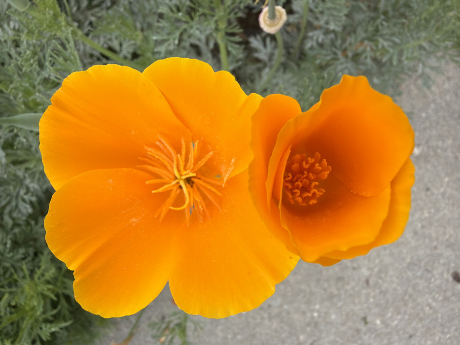 The image displays two vibrant orange California poppy flowers (Eschscholzia californica) in an outdoor setting within Rancho Palos Verdes, United States of America. The prominent upper flower is fully open, exhibiting four distinct orange petals, and a central cluster of numerous yellow stamens surrounding a darker pistil. Directly below it, a second poppy is partially open, forming an orange cup-like structure with visible orange stamens inside. The background on the right consists of blurred green-grey, finely dissected foliage, characteristic of poppy leaves, with a small, light-colored floral bud or seed pod visible on the far right edge. The left and lower portions of the background feature a light grey, coarse-textured surface consistent with concrete or pavement. No human subjects, animals, or artificial objects other than the implied concrete are present.