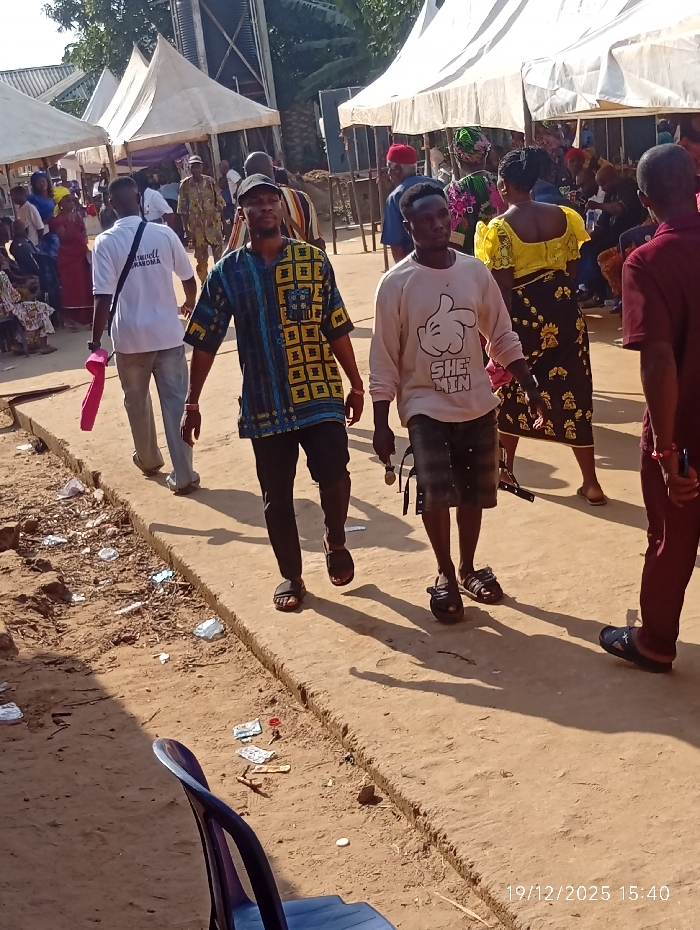 The scene depicts an outdoor gathering or market activity in Isinyi-Nando, Nigeria. In the immediate foreground, a blue plastic chair is partially visible on the left, next to a dirt ground area littered with plastic wrappers and small debris. This dirt area borders a slightly elevated, lighter-colored concrete pathway or curb running diagonally across the image. Multiple individuals populate the midground. Two men are prominently walking towards the viewer: one in the center-left wears a black cap, a blue and yellow patterned short-sleeved shirt, black trousers, and dark sandals; the other in the center-right wears a light beige long-sleeved shirt with a cartoon hand graphic and "SHE MIN" text, dark shorts, and dark sandals. Behind the first man, another man walks away, wearing a white t-shirt with "Emanuell ONANOMA" printed on the back, light-colored trousers, and carrying a pink item in his left hand. To the far right, a man in a maroon shirt and dark trousers, facing away, is also walking. A woman in a yellow top and a patterned dark skirt is visible walking away from the viewer behind the central figures. The background features numerous people congregated under several white canopy tents, suggesting a community event. A tall, dark metal structure, possibly a water tower or antenna, rises above the tents on the left side of the background. The environment is bright and sunny, indicated by distinct shadows cast by the individuals on the ground. A digital timestamp "19/12/2025 15:40" is present in the bottom right corner.