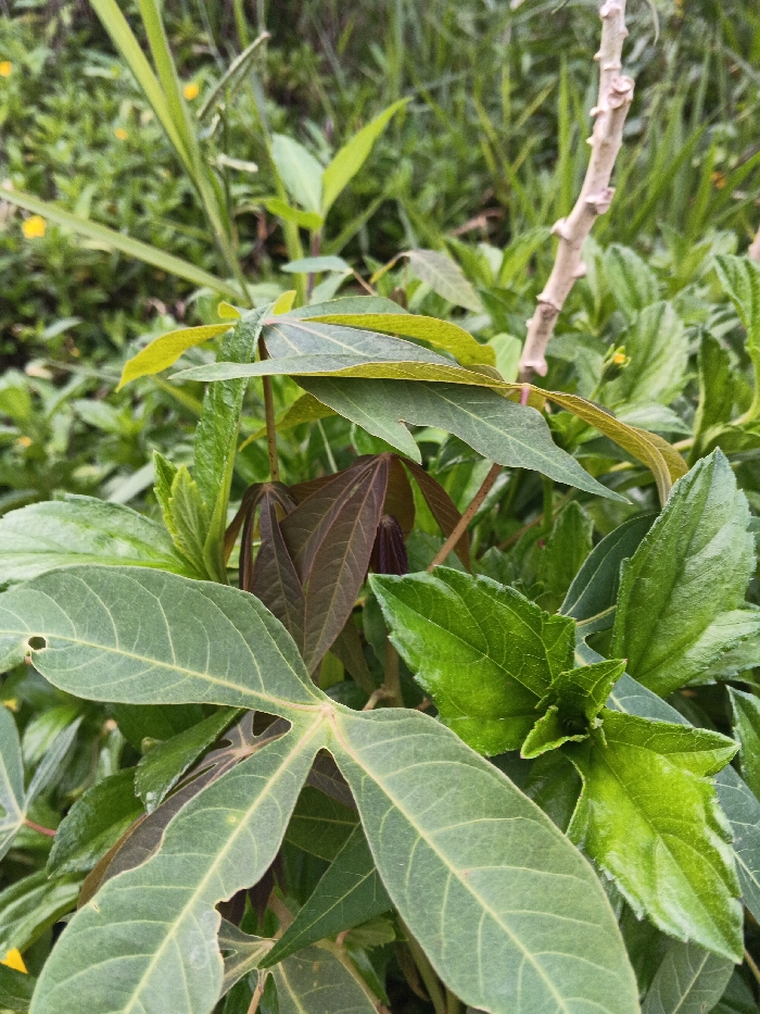 The image displays a close-up, ground-level view of dense, green foliage, indicating an outdoor natural environment in Đà Nẵng, Vietnam. Dominating the foreground and mid-ground is a cassava plant (Manihot esculenta), identifiable by its large, palmate leaves; these are primarily dark green, with prominent lighter green venation. One such leaf in the lower-left quadrant exhibits a small, irregular hole on its surface. Younger cassava leaves, situated centrally, display a distinct reddish-brown coloration. Surrounding the cassava are various other plants featuring smaller, ovate to irregularly serrated bright green leaves. A bare, light brown woody stem, likely from a larger plant or bush, with distinct nodes, extends vertically in the upper-right portion of the frame. The background is a soft-focus expanse of green vegetation, including tall grass, with subtle hints of small yellow flowers. The scene is illuminated by ambient natural light, casting no distinct shadows.