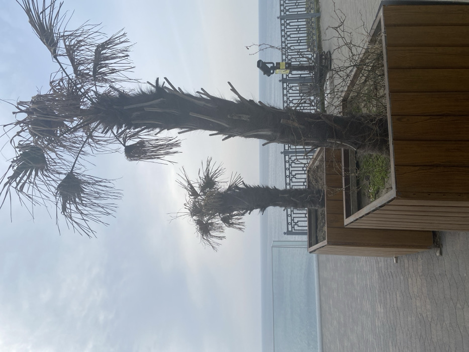 The image depicts a coastal promenade in Anapa, Russia, under an overcast sky. In the foreground, a grey paved walkway extends from the bottom of the frame. Two large, rectangular wooden planters, constructed from vertical light brown slats, are positioned on the walkway. Each planter contains a single, desiccated palm-like tree with bare, spiky fronds and a textured trunk; the taller tree is in the front-right, and a shorter tree is directly behind it in the center. The soil within the planters appears dry, with minimal green growth and scattered dry branches, particularly around the base of the foreground tree. In the midground, a barrier separates the promenade from the sea. To the left, a clear glass panel serves as a railing. To the right, a dark grey or black decorative metal fence with intricate scrollwork runs horizontally. Between these barriers, slightly to the right of the foreground tree, a dark-colored, coin-operated binocular viewer on a pedestal is oriented towards the water, displaying a yellow instruction sticker. Beyond the barriers, the calm, grey-blue expanse of the sea stretches to the horizon under a uniformly light grey, cloudy sky. No individuals or active subjects are present in the scene.