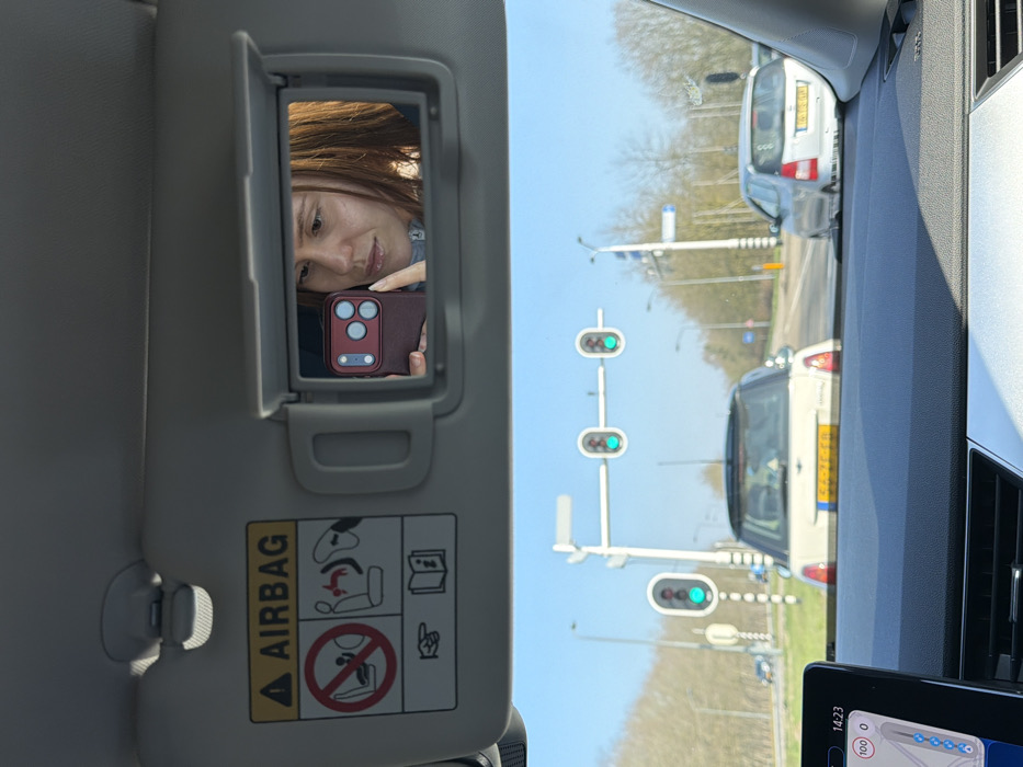 The image depicts the interior of a vehicle, viewed from the driver's perspective, looking forward through the windshield. In the upper portion, a light-colored passenger-side sun visor is visible, bearing a yellow and black "AIRBAG" warning label with associated diagrams. The vanity mirror within the visor is open, reflecting a female individual with reddish-brown hair. She is holding a dark red smartphone, featuring a triple camera array, with her right hand, her index finger extended towards the device. Through the windshield, a road scene unfolds under a clear blue sky. Directly ahead, three traffic lights display green signals: one vertical light on the left and two horizontal lights overhead. Vehicles are present in multiple lanes. Immediately in front of the viewer's vehicle is a white Mini Cooper with the Dutch license plate "GP-330-R". To the right of the Mini Cooper, in an adjacent lane, is a silver hatchback with the Dutch license plate "16-TJS-6". The road is lined on both sides by trees, some appearing bare, indicating a colder season. A digital display on the vehicle's dashboard shows "14:23" and navigation information, including a current speed of "100" with a map fragment. This scene is located at the intersection of Deurneseweg (N606) and Kanaaldijk Noord/Zuid in Helmond, Netherlands. The vehicle is positioned on Deurneseweg, approaching the intersection with green lights indicating permission to proceed.
