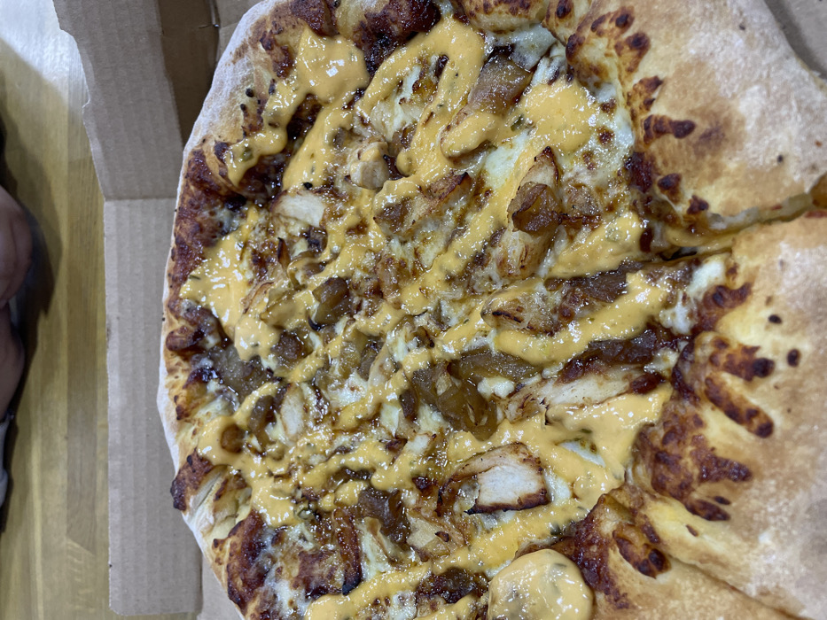 A high-angle, close-up photograph displays a full, multi-slice pizza presented in an open, light-brown corrugated cardboard pizza box. The pizza features a thick, golden-brown crust with some darker, baked spots. Its surface is topped with visible pieces of cooked chicken and caramelized or sautéed onions, spread over a lighter base, likely cheese. A thick, yellowish-orange, creamy sauce is liberally drizzled in a distinctive zig-zag pattern across the entire pizza. In the upper background, out of focus, a light-colored wooden surface is visible, along with the partially obscured hands and forearms of an individual resting on this surface. The scene is located in Stara Zagora, Bulgaria.