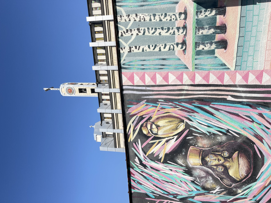 An outdoor, low-angle shot captures a multi-sectioned mural in the foreground with a prominent church building and clock tower in the background, set against a clear blue sky