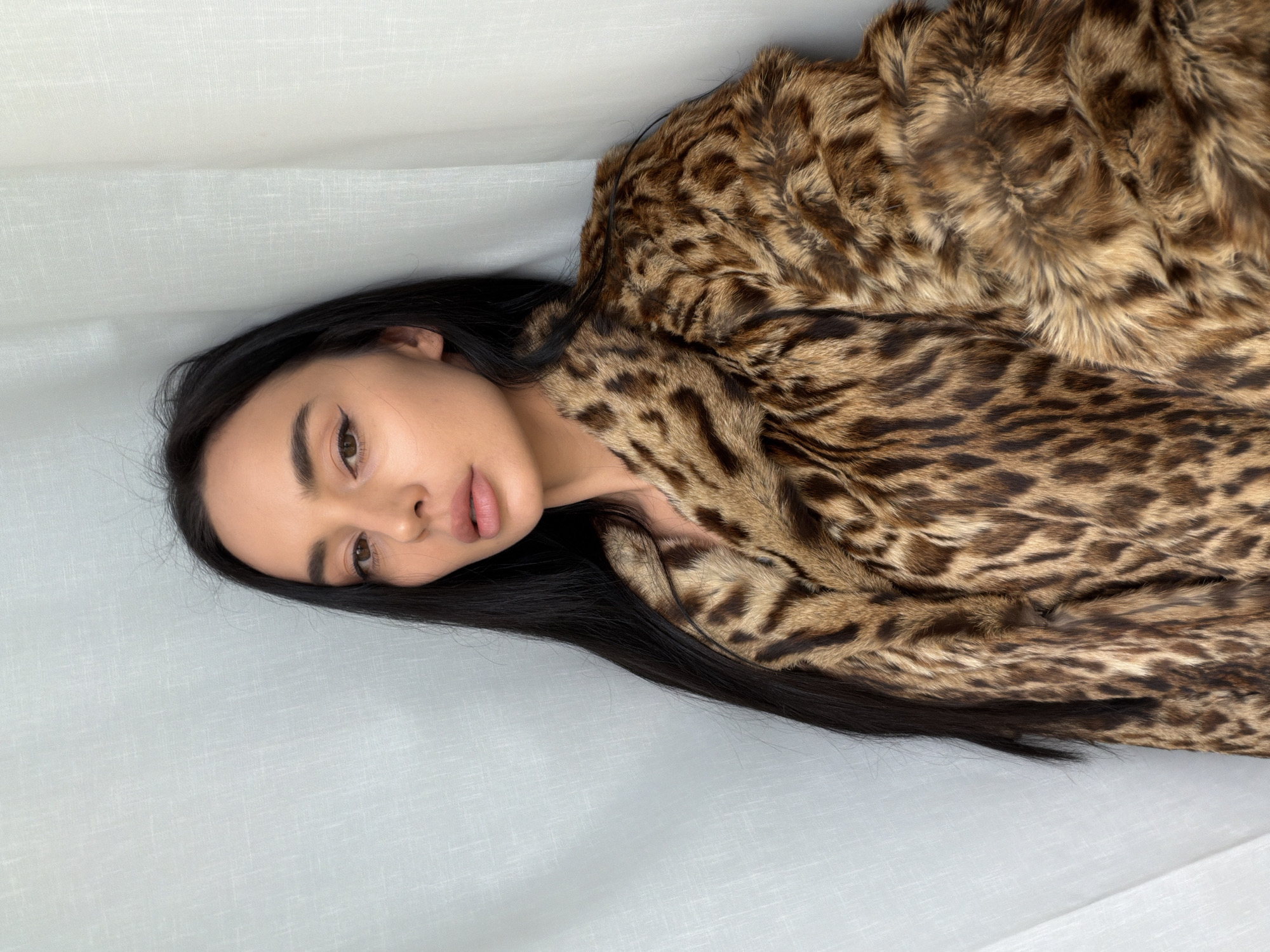 A female individual is depicted in a half-body portrait, positioned in an indoor setting. She has long, dark hair extending over her shoulders and down her front. Her face is turned slightly towards the viewer, featuring brown eyes with winged eyeliner and light pink lips. She maintains a neutral facial expression and gazes directly at the camera. The subject is wearing a brown and black patterned faux fur coat, exhibiting spotted and striped markings reminiscent of a leopard or ocelot pelt. The coat has a visible collar and covers her upper torso and arms. The background consists of two light-colored, possibly off-white or light gray, plain fabric surfaces, likely curtains or textured walls, forming an interior corner behind the subject. The specific location within Grad Rijeka, Croatia, is not discernible from the provided image.
