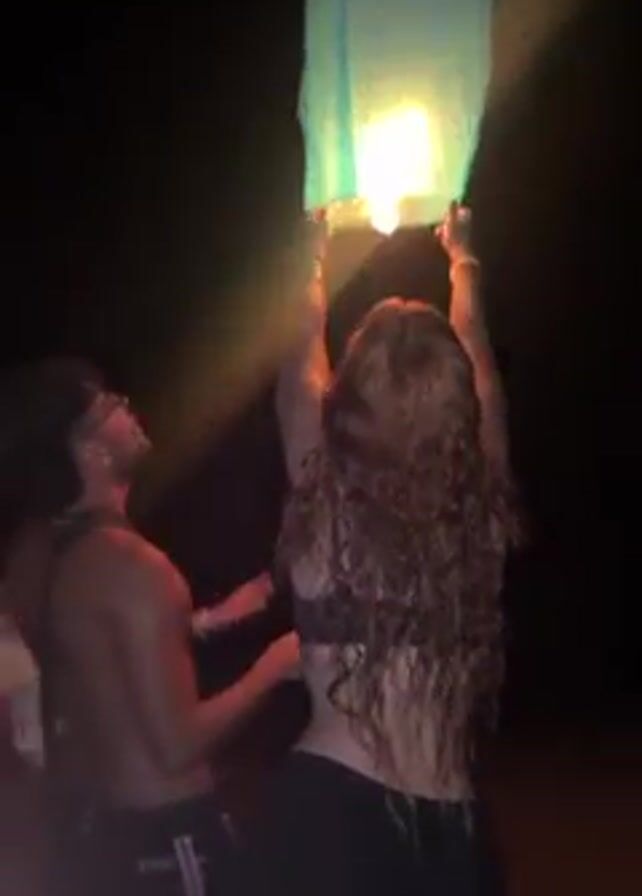 A woman in a black bra and pants releases a green sky lantern into the night sky