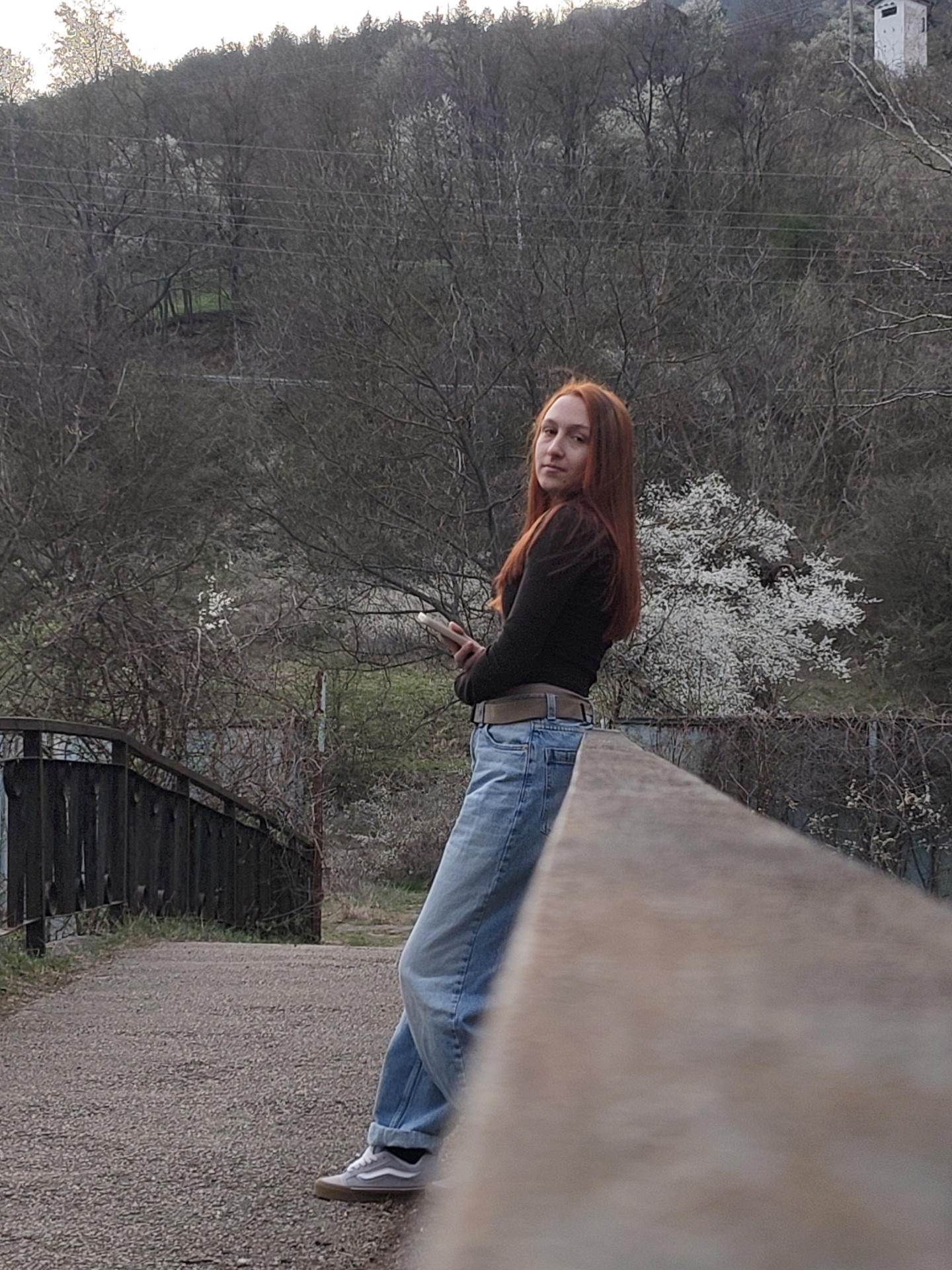 A young, red-haired woman stands on a bridge. She is wearing a brown, long-sleeved shirt, blue jeans, and grey shoes. She holds a phone in her hands. The bridge has a wooden railing. Behind the woman are trees and vegetation on a hillside. In the background, a small white structure stands on the hillside. The location is Zgorigrad, Bulgaria.