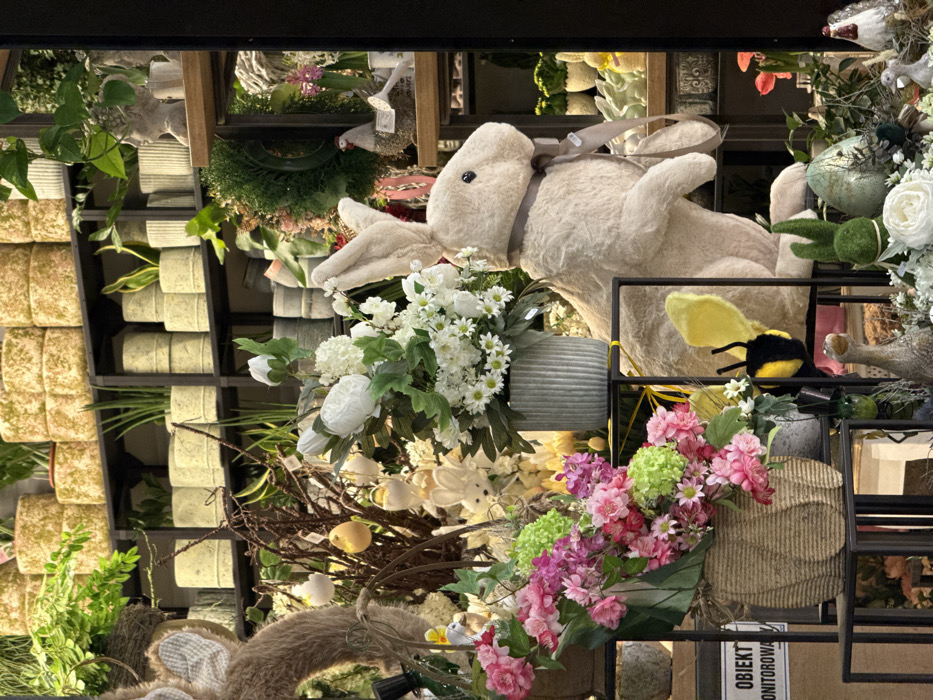 This image depicts a retail display within a commercial establishment in Tarnów, Poland, densely populated with decorative items, primarily focusing on spring and Easter themes. In the mid-ground, a large, upright, cream-colored plush rabbit figurine, adorned with a light brown ribbon tied in a bow, stands prominently on a dark metal display shelf, slightly right of center. To the left of the rabbit, a woven, light brown pot holds an arrangement of artificial pink and lime green flowers. Adjacent to this, a fluted gray vase contains an arrangement of white artificial flowers, including daisies. Behind these floral displays, a branched structure is adorned with hanging small white and yellow egg ornaments and miniature white bunny figurines. A black and yellow bumblebee figurine with yellow felt wings is positioned on a shelf below the large rabbit. The bottom display shelf features a collection of smaller Easter-themed items, including two green fuzzy bunny figurines, a speckled green egg, and various decorative bird figurines, one resembling a white hen. A partial white sign with black text, reading "OBIEKT MONITOROWA" (likely "Monitored Area"), is visible in the lower-left corner. The background is structured with dark shelving units. These shelves are filled with numerous potted green plants, such as snake plants and ivy, housed in a variety of light-colored, textured ceramic pots. The uppermost shelves display stacks of circular, textured objects with a mottled green-brown finish. Other background elements include a green decorative wreath and a gray bust sculpture of a head on an upper shelf. The entire scene is brightly illuminated by artificial lighting, producing soft shadows. No people are visible.