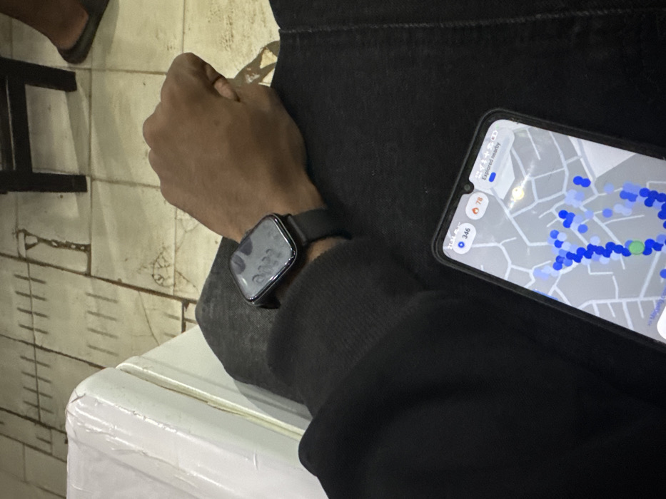 A dark-skinned person's arm rests on a white surface. The person wears a smartwatch displaying a mirrored reflection. A smartphone lies on the arm, its screen showing a map with blue and white markings, likely a navigation app. The individual is clad in dark-colored clothing, with a black jean. Parts of their foot and another stool or seat are partially visible in the background.