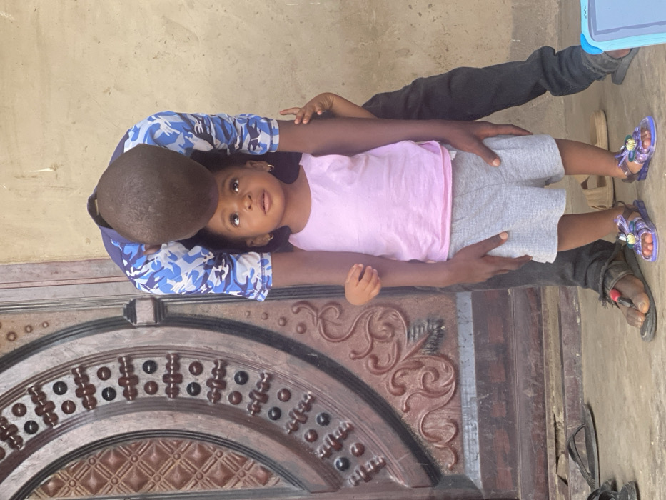 A young child lies on a person's arms. The child wears a pink top, gray shorts, and blue sandals. The person holding the child is wearing a blue and gray camouflage patterned shirt and black pants. The background includes a detailed, decorative brown door and a tan wall. A second person in black pants and sandals is visible behind the first person. The photo seems taken outdoors with natural lighting.