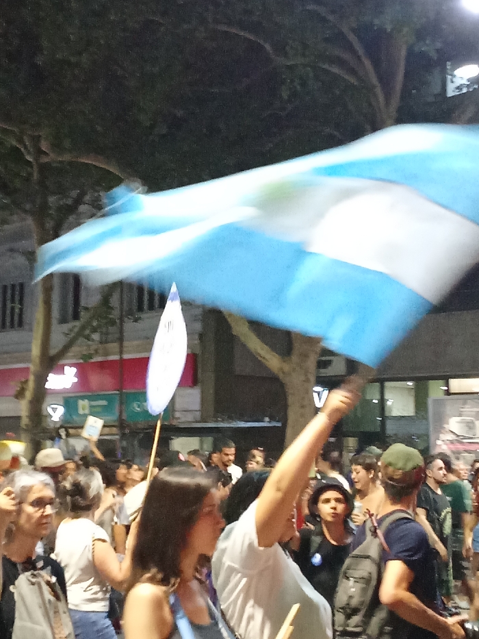 A crowd of people, including a woman in a white shirt holding up a waving Argentine flag, are gathered on a city street at night. Trees and building facades form a backdrop to the scene. Several other people are visible, including one carrying a smaller flag on a stick. The overall atmosphere suggests a protest or demonstration.