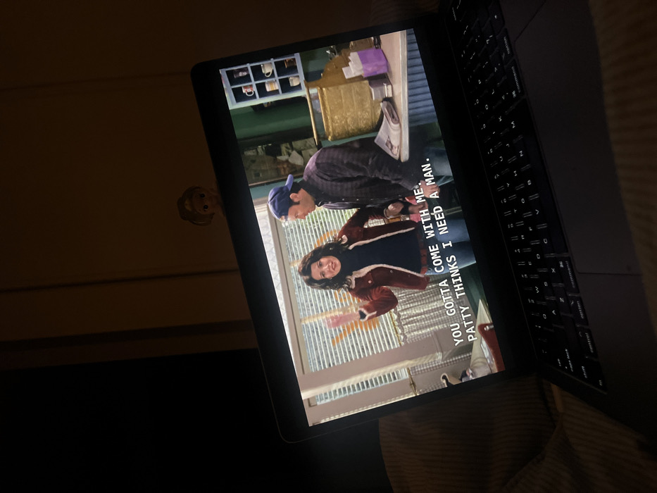This image, captured in the city of Paris, France, displays a dark-colored laptop resting on a light-colored, striped fabric surface, likely a blanket or upholstery. The laptop screen shows a scene from the television series "Gilmore Girls." The foreground of the screen features two characters: a female on the left, identified as Lorelai Gilmore, wearing a red-brown jacket with a fleece collar over a dark blue turtleneck and jeans, gesturing with her left hand. To her right stands a male character, identified as Luke Danes, wearing a dark blue baseball cap and a dark plaid shirt. They appear to be indoors, possibly in Luke's Diner, with horizontal blinds visible through windows in the background and a counter area with a newspaper and napkin dispenser to the right. Subtitles are prominently displayed at the bottom of the screen, reading: "YOU GOTTA COME WITH ME. PATTY THINKS I NEED A MAN." A small figurine, depicting a blonde character with a bun, is perched on the top edge of the laptop screen. The environment surrounding the laptop is dimly lit, with a warm, yellowish-brown wall or furniture visible in the background.