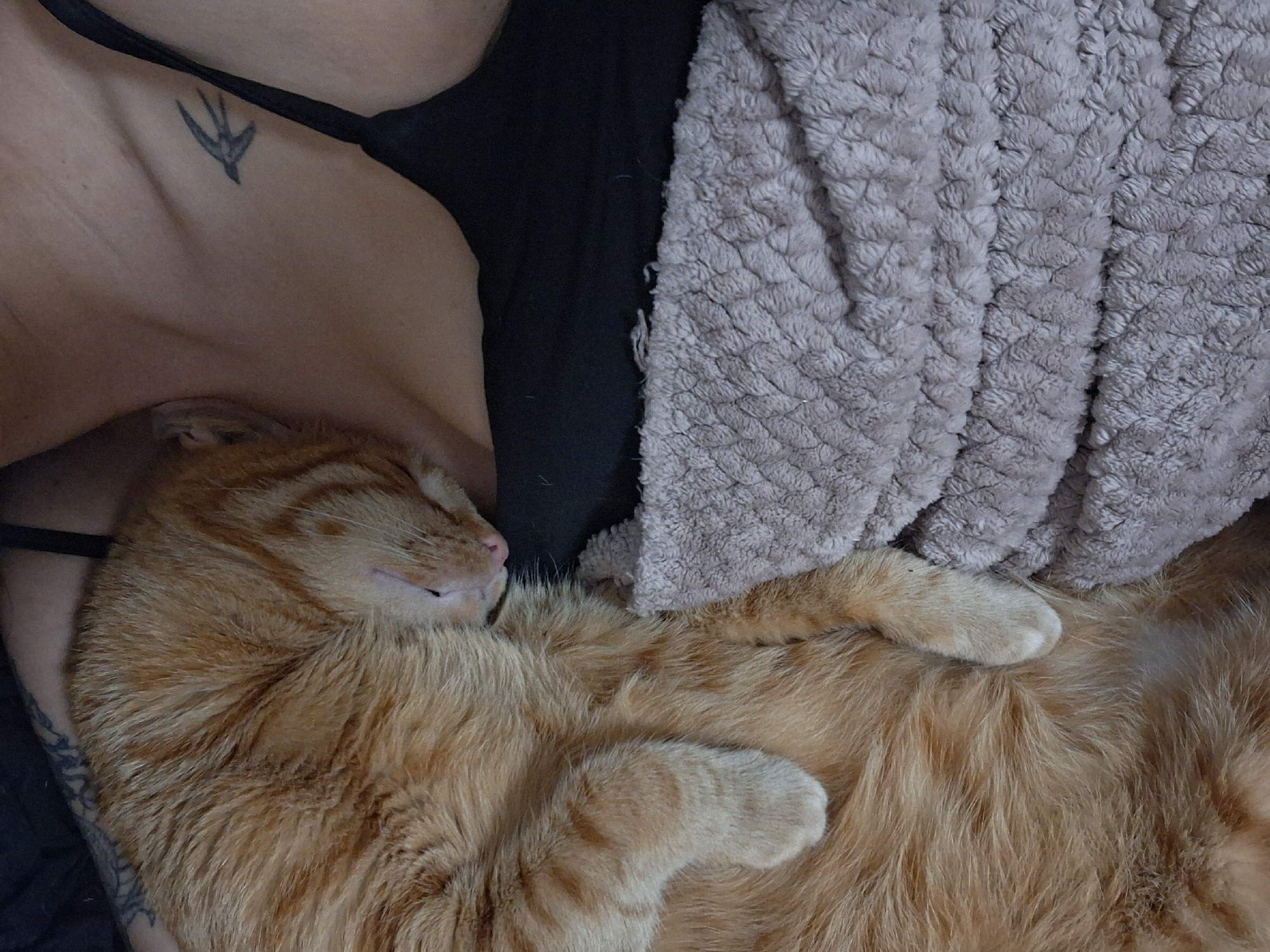 A high-angle close-up photograph depicts a light orange tabby cat sleeping on a person's chest. The person is wearing a black top and has a tattoo of a bird-like shape on their upper chest. A soft, light grey blanket is draped partially over the cat and the person's upper body. No location information can be obtained from the image.