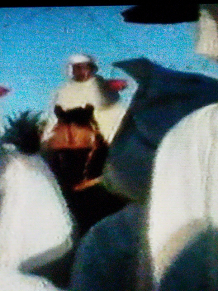 The image depicts an outdoor scene in Meknes, Morocco. A central figure, dressed in light-colored traditional North African attire including a head covering, is mounted on an animal, likely a horse or mule. A reddish-brown saddle or blanket is discernible on the animal's back. A distinct red element is visible near the rider's right side. Portions of other individuals or objects, draped in white or off-white fabric, occupy the foreground and the right side of the frame. Darker, less defined forms are present on the left. The background consists of a light blue, granular sky. A dark, angular shape is partially visible at the top right of the frame. The overall image is heavily pixelated and out of focus.
