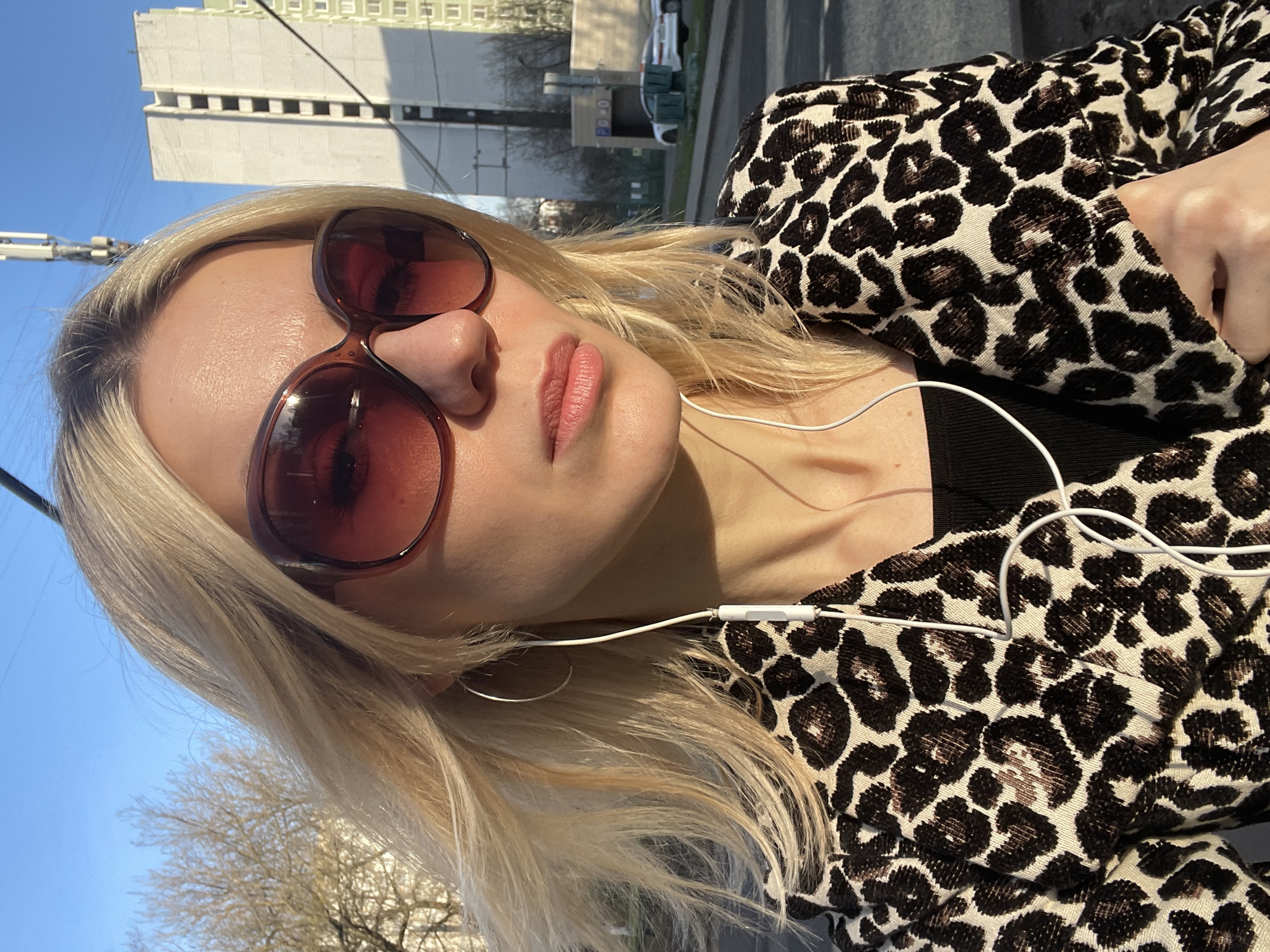 A woman is seen in a medium close-up shot, wearing large round sunglasses with a brown frame and dark lenses that reflect the surroundings. She has fair skin, light blonde hair styled to one side, and is wearing headphones with the wire visible. Her expression is neutral. The woman is wearing a black top under a jacket with a leopard print pattern of brown spots on a cream background. A silver hoop earring is visible on her left ear. The background features a building with a simplistic, rectangular design, suggesting Soviet-era architecture. The sky is bright blue, indicating a sunny day. There are bare tree branches visible as well as a partial view of what looks to be a street with other buildings and possibly some traffic infrastructure. Without additional context or information, it's not possible to pinpoint the specific location of the picture in Moscow. The architectural details of the building in the background would need to be compared with specific Moscow locations.