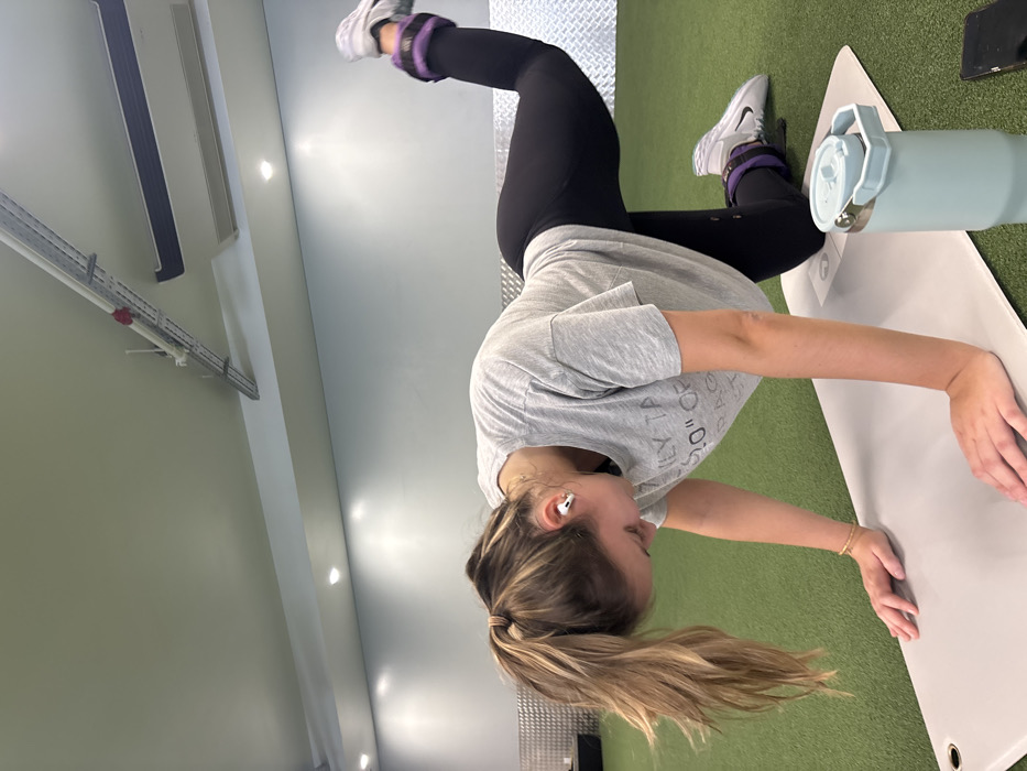 A female individual is depicted performing an exercise on a light grey mat within an indoor fitness facility located in Lisbon, Portugal. She is positioned on her hands and right knee, with her left leg extended backward and upward. Her head is bowed, looking towards the mat. She wears a light grey short-sleeved t-shirt with partial text, black full-length leggings, white athletic shoes with purple ankle weights attached to both ankles, and white wireless earbuds in both ears. Her blonde hair is styled in a high ponytail. A thin gold-colored bracelet is visible on her right wrist. To her right, on the mat, rests a light blue insulated water bottle with a straw lid, next to which a dark-colored smartphone is partially visible. The floor is covered with green artificial turf. The background features light blue walls, a lower section of textured metal paneling on the right, and a light-colored ceiling equipped with recessed circular lights, a white cable tray system, and a white wall-mounted air conditioning unit.