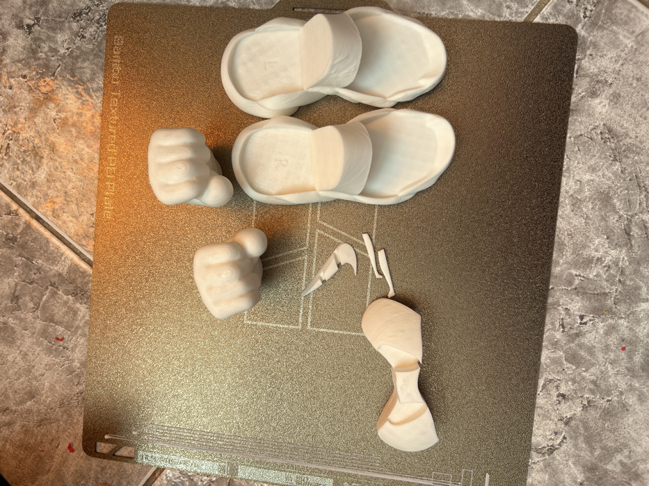 The scene, located in Sofia, Bulgaria, features a gold-colored Bambu Textured PEI Plate, oriented with its text "Bambu Textured PEI Plate" visible upside down in the upper right. The plate rests on a light grey tiled floor with dark grey veining. Arranged on the plate are several white, FDM 3D-printed objects exhibiting visible layer lines. Two closed fists are positioned towards the upper left, one slightly larger than the other. To the right, two sandal-shaped objects are placed side-by-side, with the letters 'R' and 'L' faintly impressed into the heel beds of the right and left sandals, respectively. To the lower left, a fragmented 3D-printed object is present, consisting of a larger, curved piece and several smaller, elongated fragments. Sparse red particulate matter is visible on the tiled floor near the top left corner of the image. No individuals are present, and all objects are static.