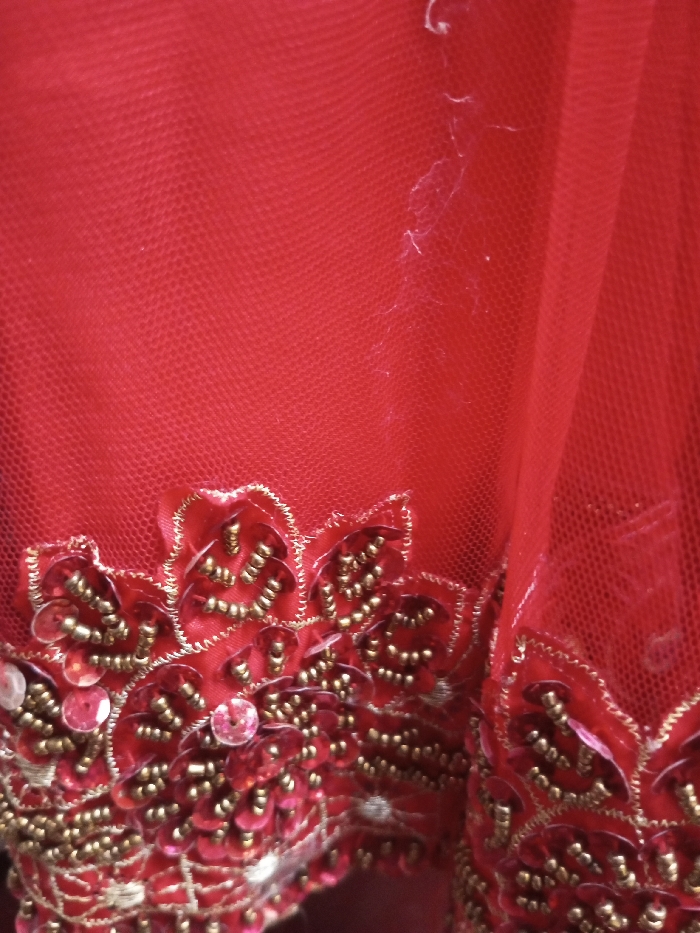 A close-up forensic examination reveals a vibrant red textile, consistent with a garment fabric, located in Ciherang, Indonesia. The primary subject is a fine-mesh material, likely tulle or net, displaying a translucent hexagonal weave structure. The lower section of the fabric is adorned with an elaborate border featuring gold metallic thread embroidery, forming repetitive stylized floral or leaf-like motifs. Within these embroidered outlines, numerous small, gold-colored cylindrical seed beads are densely stitched. Interspersed among the beaded areas are flat, circular, translucent sequins, primarily in shades of pink and red, reflecting ambient light. The upper, unembellished portion of the red mesh fabric exhibits scattered white fibrous debris or lint. The textile shows minor folds and drapes, indicating its pliable nature. No people, specific actions, or direct interactions are visible within the frame.