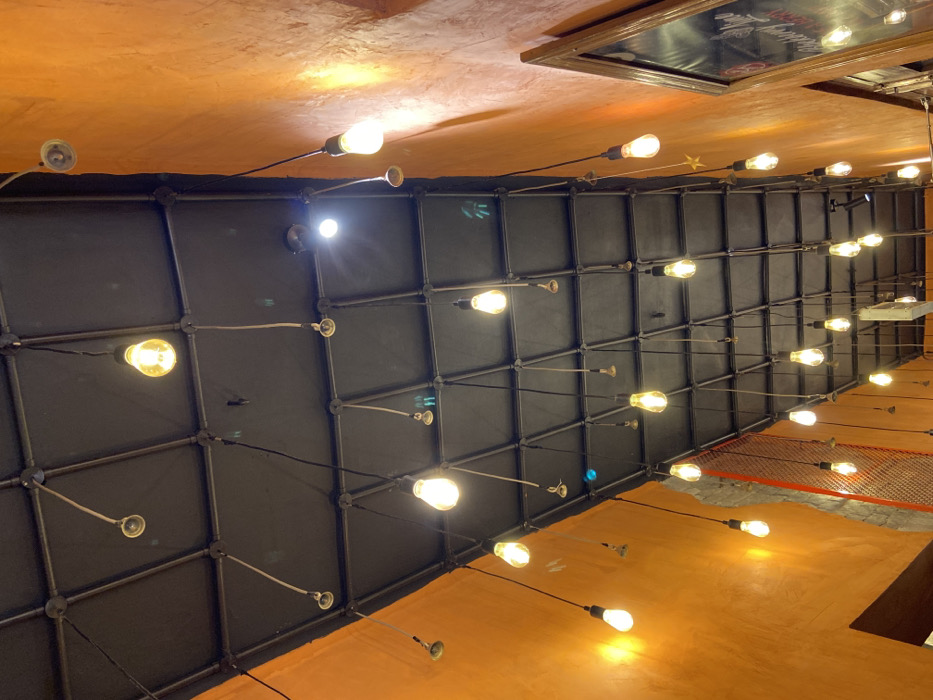 The image displays an interior architectural perspective, angled upwards, within a commercial establishment in Dhaka, Bangladesh. The dominant features are a dark grey or black ceiling structured with a visible grid of square or rectangular panels, and an adjacent textured wall painted a vibrant, solid orange color. Numerous bare incandescent light bulbs, primarily emitting a warm yellow-orange light, are suspended from the ceiling grid at various lengths by exposed electrical wiring. The wires connect to small circular mounting points or conduit fittings integrated into the grid. Some bulbs appear to be Edison-style. A few smaller, potentially white LED spotlights are also visible on the ceiling structure. The orange wall on the right exhibits textural variations and receives direct illumination from the suspended bulbs. Towards the lower right of the frame, a portion of a wooden-framed object, possibly a mirror or a chalkboard, is discernible against the orange wall. No individuals are present in the scene. The environment suggests an indoor setting, likely a cafe, restaurant, or similar venue, characterized by its distinctive lighting and color scheme.