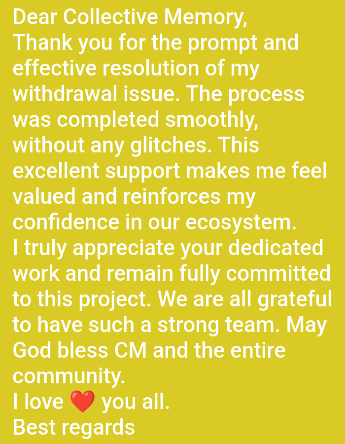 A heartfelt message addressed to "Collective Memory" expresses gratitude for the quick and seamless resolution of a withdrawal issue. The sender feels valued and confident within the ecosystem due to the excellent support. They express deep appreciation for the team's dedicated work and reaffirm their commitment to the project. The message conveys gratitude for the strong team and concludes with a blessing for "CM" and the entire community, followed by an expression of love and best regards.