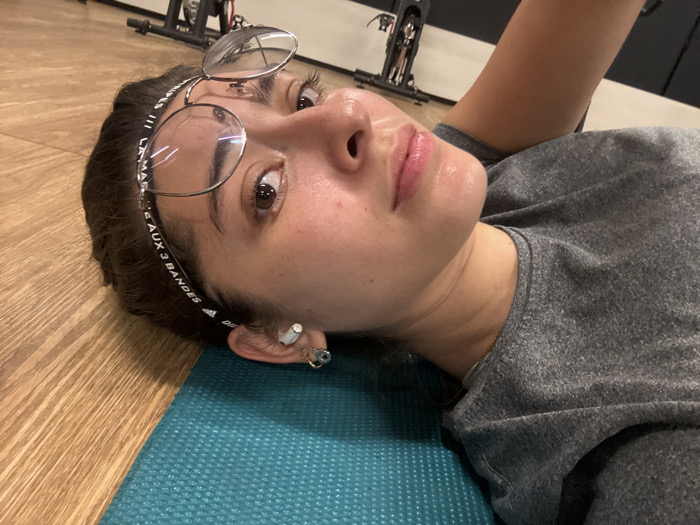 An individual is depicted lying on their back on a teal exercise mat in what appears to be an indoor fitness facility. The subject, a female with dark hair, is wearing a grey short-sleeved t-shirt and a black Adidas headband with white text pushed up onto her forehead. Clear-framed glasses with round lenses are resting on the headband. Her face exhibits a neutral expression with a subtle sheen on the skin. Multiple piercings are visible on her left ear, including a white earbud-like object and a small hoop earring with a light-colored bead. The floor is light-colored wood, and in the background, partially obscured and out of focus, are dark-colored stationary exercise bicycles. The specific city of Komchén, Mexico, is not discernible from the visual information provided within the image.