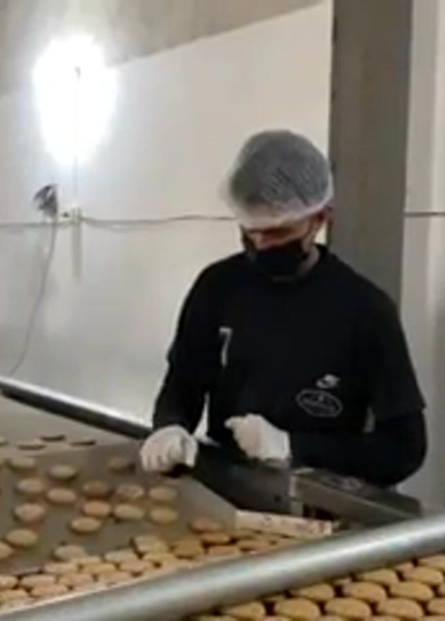 In a well-lit industrial space, a worker wearing a black shirt, hairnet, face mask, and white gloves stands at a conveyor belt. The belt is covered with rows of round, tan cookies, and the worker is picking through them. The room is predominantly white and grey, with concrete walls and metal support beams. A fan is visible on the wall. The video appears to be showing part of a food production process.