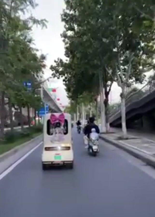 street scene with a white, electric vehicle decorated with a pink bow in the back. It is followed by two scooters with drivers wearing helmets. The road is lined with trees, and an elevated roadway is on the left.