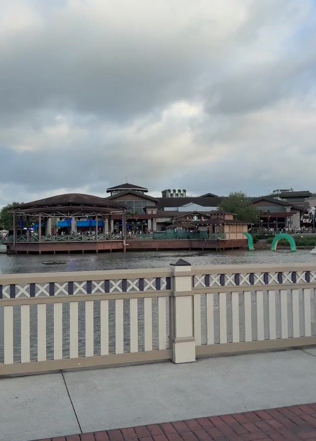 pedestrian bridge at Disney Springs in Orlando, Florida. People of various ages, attire, and groupings are walking across the bridge. Visible in the background are buildings including a Ghirardelli store, the Paddlefish restaurant, a body of water with fountains, overcast skies, and architectural elements. The camera follows people as they cross the bridge, providing a view of the surroundings.