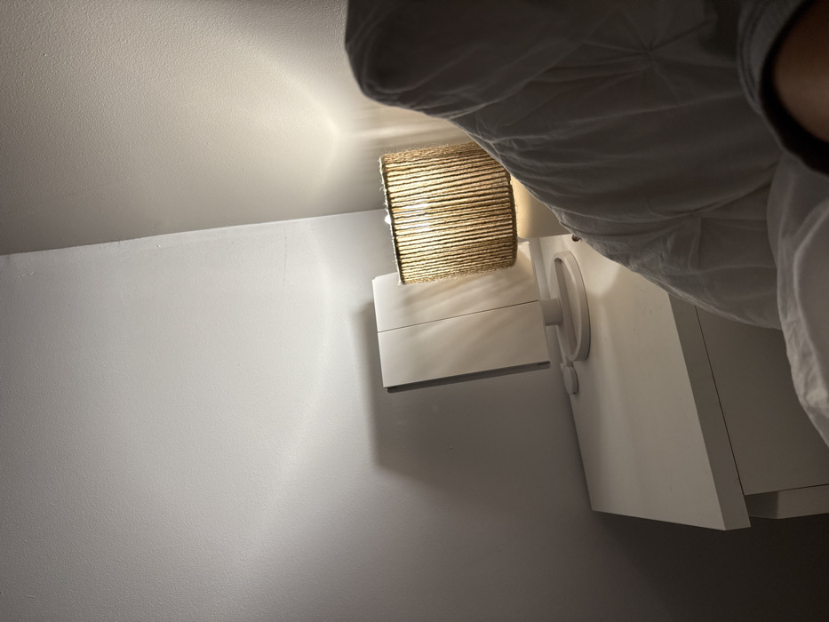 A low-angle shot reveals a white wall with a visible bedside table, topped with a cylindrical lamp wrapped in natural fiber