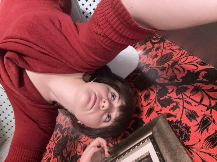 - "A fair-skinned person with bangs and a red sweater lies on a red and black floral patterned surface" by FM-IdNfF2, licensed under CC BY 4.0