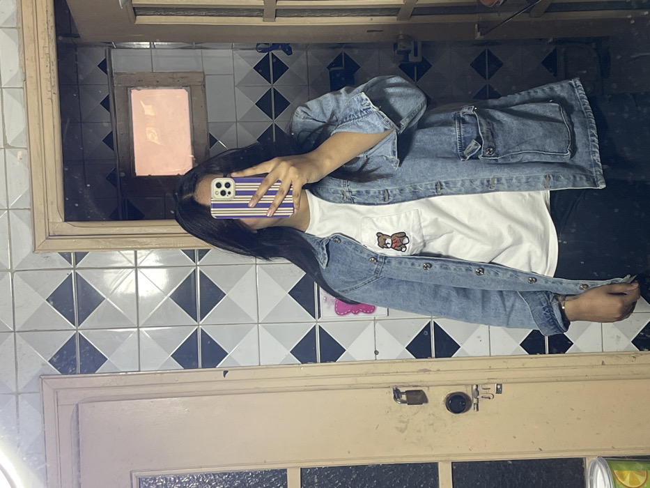 An individual is depicted taking a mirror selfie inside a room within a residential dwelling in Meknes, Morocco. The subject, identifiable by long, dark hair, occupies the central frame, obscuring their face with a smartphone held in their right hand. The phone case is purple with vertical gold stripes, featuring a multi-lens camera module. The subject wears a white t-shirt adorned with a teddy bear patch on the left chest pocket, overlaid by a light blue denim jacket with its sleeves rolled up, and dark pants. A gold-colored bracelet is visible on the subject's left wrist. The background features a tiled wall with a repeating geometric pattern of white and dark gray squares. To the left, a light-colored wooden door frame is visible, along with a portion of a door equipped with an aged lock mechanism and a separate brass padlock. A partial view of a white can with a yellow lemon graphic is visible at the bottom left. To the right, another light-colored wooden door frame is present, above which a small, rectangular window with a wooden frame reveals a muted reddish-pink illumination from an external source or adjacent space. The overall lighting is consistent with an indoor environment.