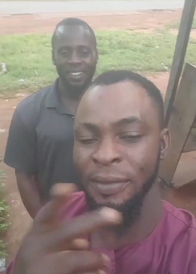 Two men are standing close together, taking a selfie. The man in the foreground has a short beard and is wearing a maroon shirt. The man behind him is wearing a grey collared shirt. Both men are looking at the camera and smiling. The man in the foreground makes hand gestures at the camera. They are standing outside, possibly near a road, with trees and greenery visible in the background. A wooden structure is partially visible on the right side of the frame.