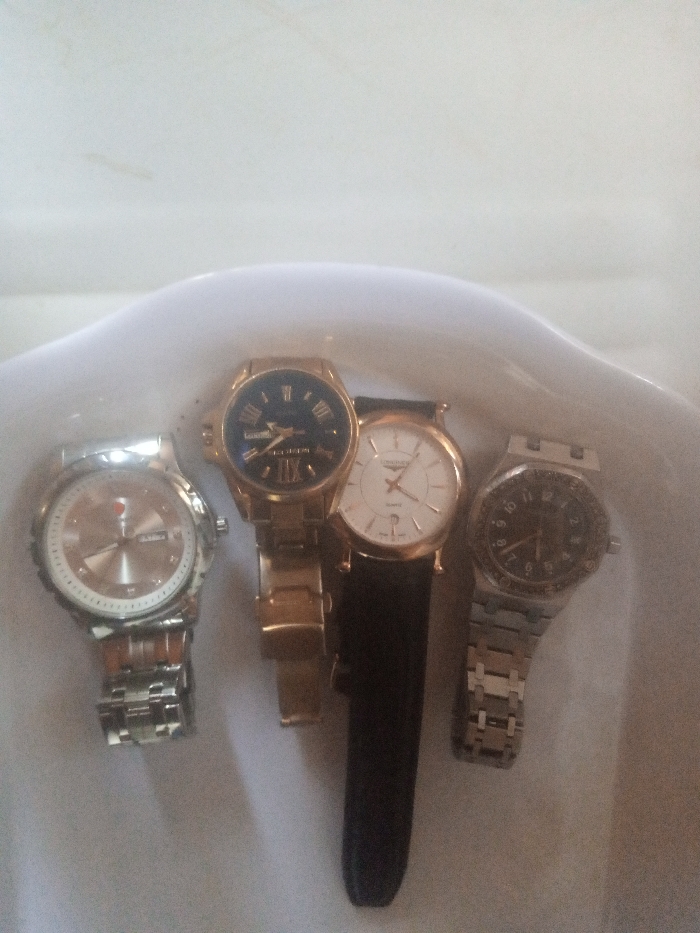 Location: Unknown, Unknown. Scene: Four wristwatches are positioned inside a white, curved container, possibly a basin or bowl, which rests on a light-colored, undefined surface. No individuals are present. Subjects/Objects: * **Watch 1 (left):** A silver-toned metallic wristwatch with a round, light-colored dial. Features include a red emblem below the 12 o'clock mark and a day/date window displaying "MON 24" at the 3 o'clock position. The band is a silver-toned metal link design. * **Watch 2 (center-left):** A gold-toned metallic wristwatch with a dark blue dial marked by gold-toned Roman numerals. The brand "CRONUS" is visible on the dial. It features a gold-toned metal link band. * **Watch 3 (center-right):** A gold-toned wristwatch case paired with a black leather-like strap. The round dial is white with gold-toned hands and indices. The dial displays "LONGINES QUARTZ." * **Watch 4 (right):** A silver-toned metallic wristwatch with a dark dial that presents light-colored Arabic numerals. The metallic band consists of rectangular links. Actions/Interactions: No actions or interactions are occurring; all items are stationary. Environment: The container and its contents are illuminated by ambient, diffuse light, set against a plain, light background.