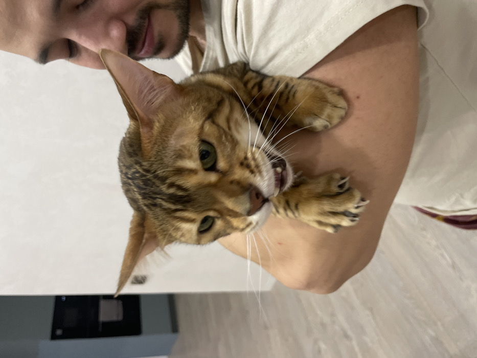 - "The image depicts a Bengal cat being held by an adult male within a modern indoor residential setting" by FM-NoKcg2, licensed under CC BY 4.0