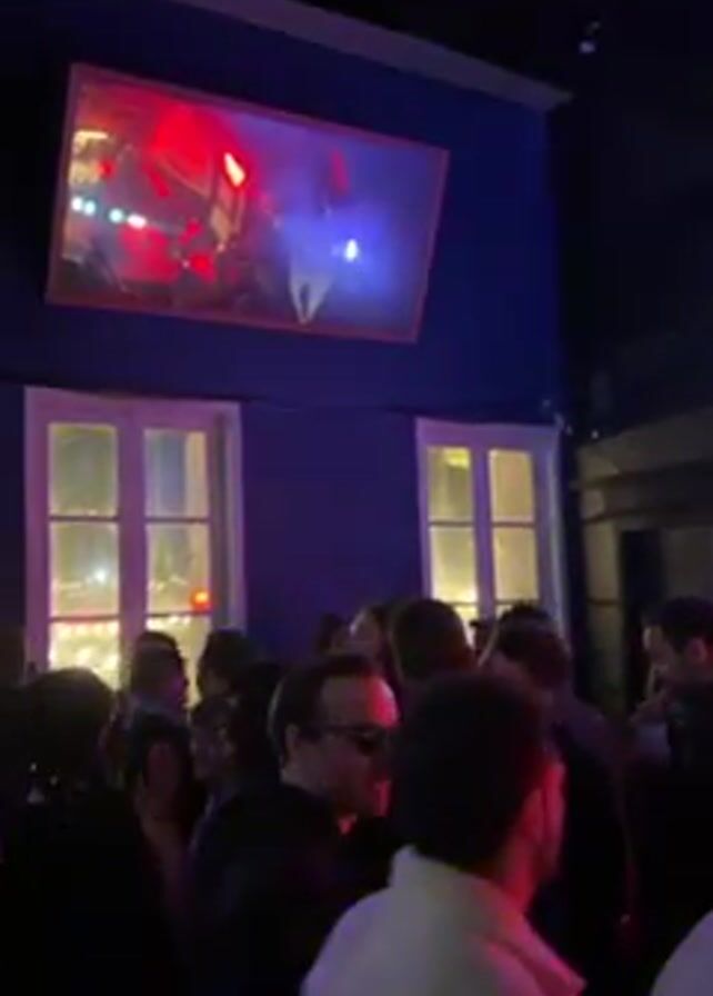 The video captures a crowded indoor scene, likely a bar or club, with people milling around