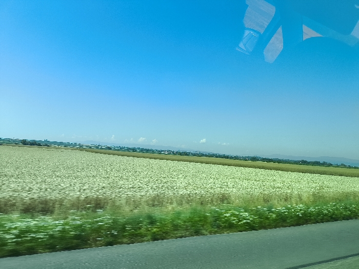 A bright, clear blue sky dominates the view above a rural landscape. A large field, possibly cotton, stretches across the middle ground. A line of trees or dense vegetation separates the field from what appears to be a distant town or settlement. The scene is likely taken from a moving vehicle, indicated by the blurred foreground and reflection in the window.