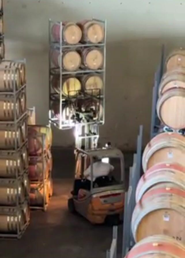 forklift in a storage area, likely a winery. The forklift is carrying a stack of nine wine barrels in a metal frame. There are rows of similar barrel stacks on either side of the forklift. The area is brightly lit, with a gray floor and white ceiling. The forklift is moving slowly and deliberately. A person is operating the forklift, but only their back and shoulders are visible.