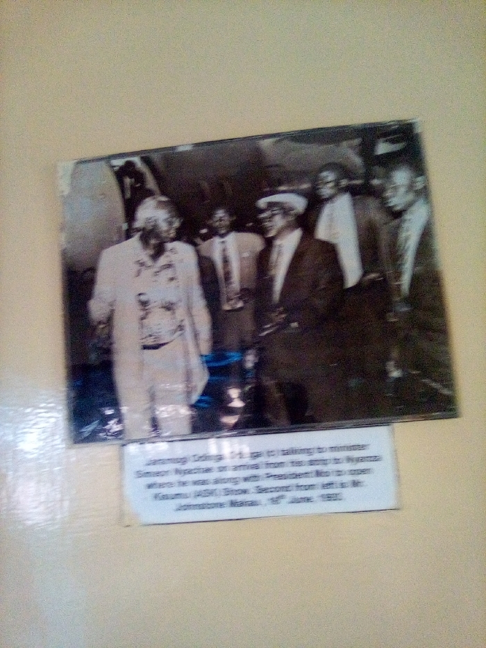A black and white historical photograph, approximately 20cm x 15cm, is mounted on a plain, light-tan wall in the South Sakwa ward, Kenya