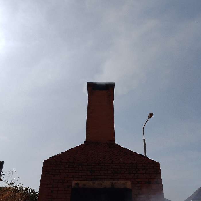 This image depicts an outdoor scene in Barden Yana, Nigeria, focused on a tall, reddish-brown brick structure against a light grey, cloudy sky. The structure appears to be an industrial or utility chimney, constructed from dark red bricks. It features a wide, rectangular base that tapers inward before transitioning into a narrower, vertical chimney stack. A large, dark, rectangular opening is present at the base of the structure. White to light grey smoke is actively emanating from the blackened top rim of the chimney stack, indicating combustion is occurring internally. Additional faint smoke or haze is visible at the lower right base of the brick structure. To the right of the chimney, a slender, dark street light pole with a single lamp fixture is visible, curving upwards. In the lower left foreground, dry, light-colored vegetation and a dark, unidentified object (possibly part of another structure or container) are partially visible. No individuals are present in the frame.