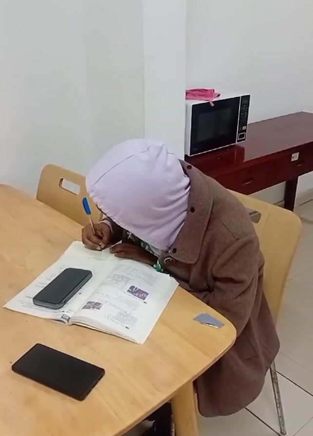 A person wearing a brown coat and light purple hoodie is sitting at a light wooden table, writing in an open book. The person is facing away from the camera, with their head down and partially covered by the hoodie. Two smartphones are on the table, one black and one silver. A microwave is visible on a dark red table in the background against a plain white wall. Two wooden chairs are positioned at the table. The floor has light-colored square tiles.
