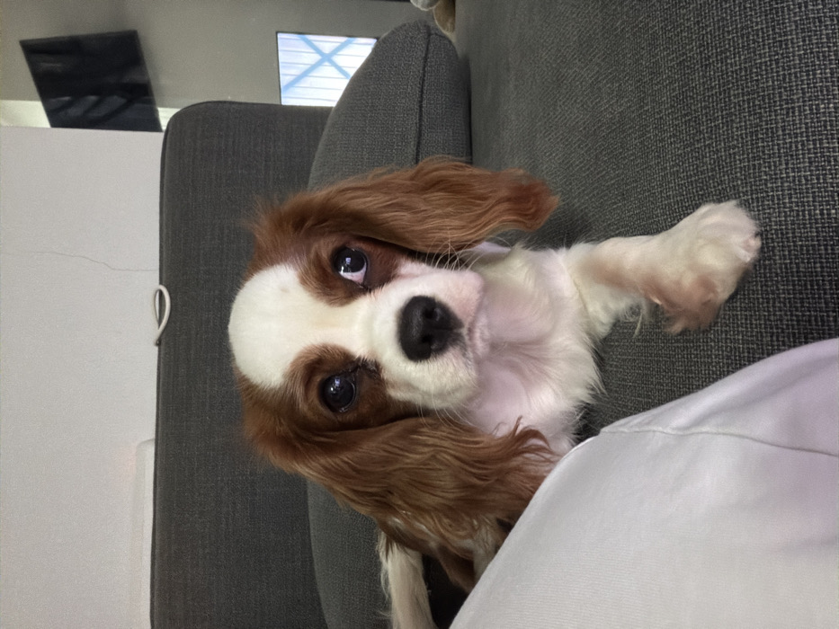 - "A Cavalier King Charles Spaniel rests on a gray couch, its head tilted towards the camera with expressive eyes" by FM-wsVVs1, licensed under CC BY 4.0