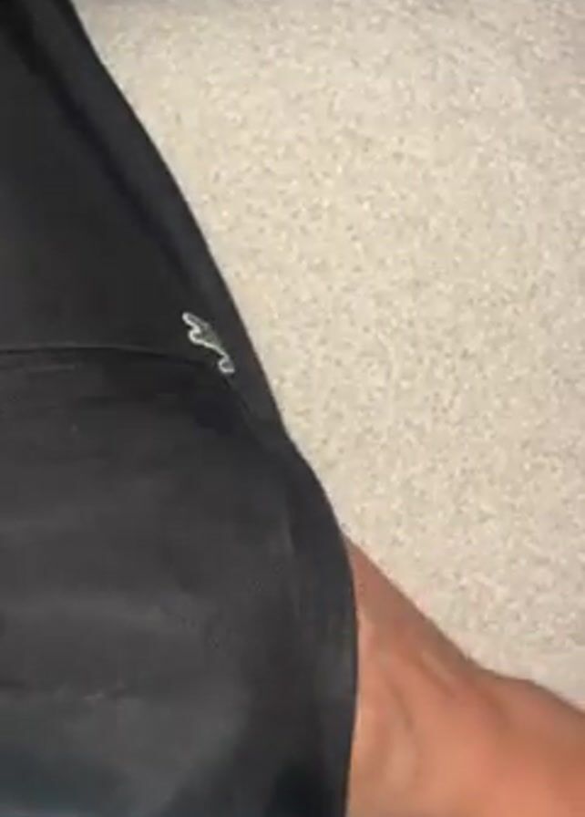 person sitting on a light gray textured couch, wearing black Lacoste sweatpants with a green logo. The person’s hand is moving under the fabric of the sweatpants on their lap.