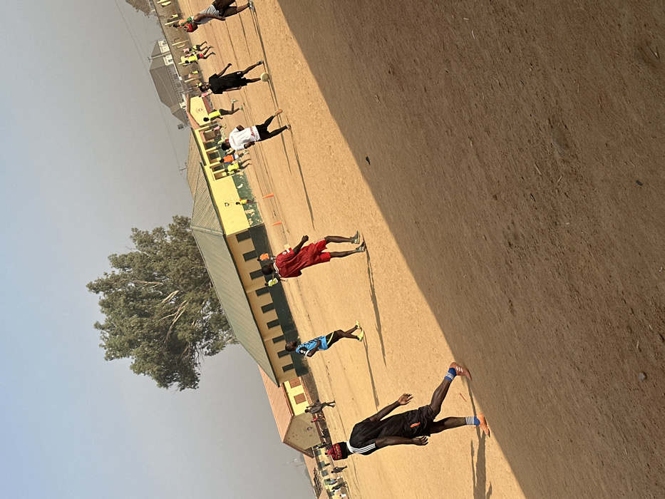 A sideways view displays people training on a dirt field beside a building. The individuals are spaced apart, seemingly performing exercises. The building is painted yellow and green with a dark roof. A large tree is visible nearby. The sky is hazy and the light is bright, casting long shadows across the dusty ground.